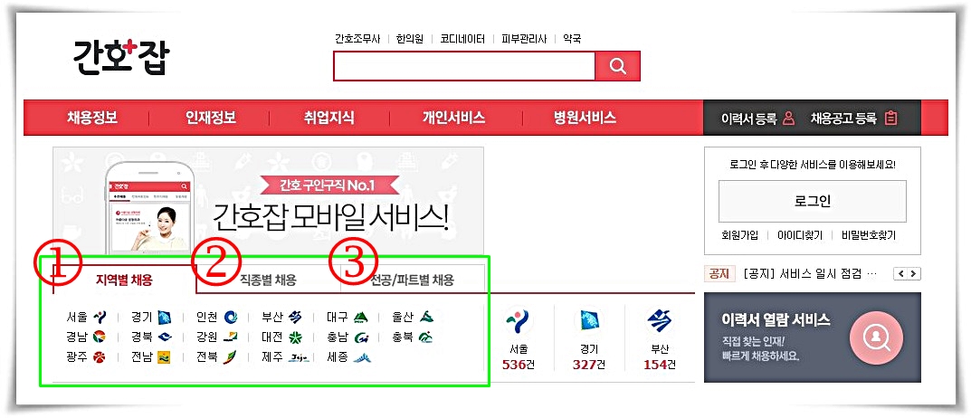 간호잡 홈페이지는 이름처럼 의료계통의 구인구직 정보를 제공하고 있는 전국 최대의 사이트가 아닐까 생각합니다.