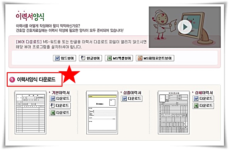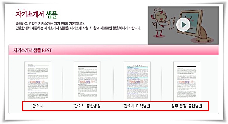 간호잡 홈페이지에는 취업정보뿐만 아니라 처음 입사를 준비하는 분들을 위해서 다양한 서식도 제공하고 있습니다.