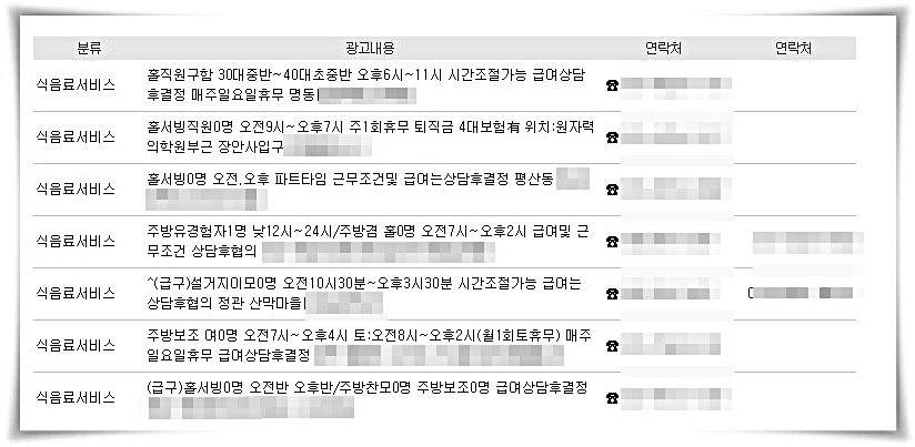 식음료 서비스 업종을 선택해서 들어가 보았습니다. 모집 공고와 함께 담당 직원의 연락처가 나와있는것을 확인할 수가 있습니다.