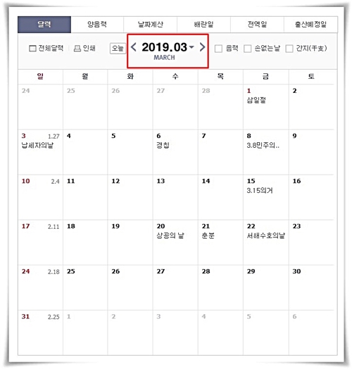 보시는 바와같이 캘린더를 살펴보면 아라비아 숫자 아랫부분에 영어로 MARCH라고 적혀있는 것을 확인할 수 있습니다.