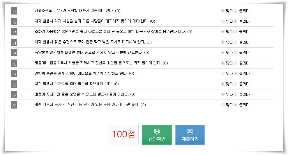 정답을 확인해 보니 100점이라는 점수를 얻었습니다. 공부도 안 하고 동영상도 대충 보았는데 기본 상식으로만 풀어서 이러한 결과가 나왔습니다.