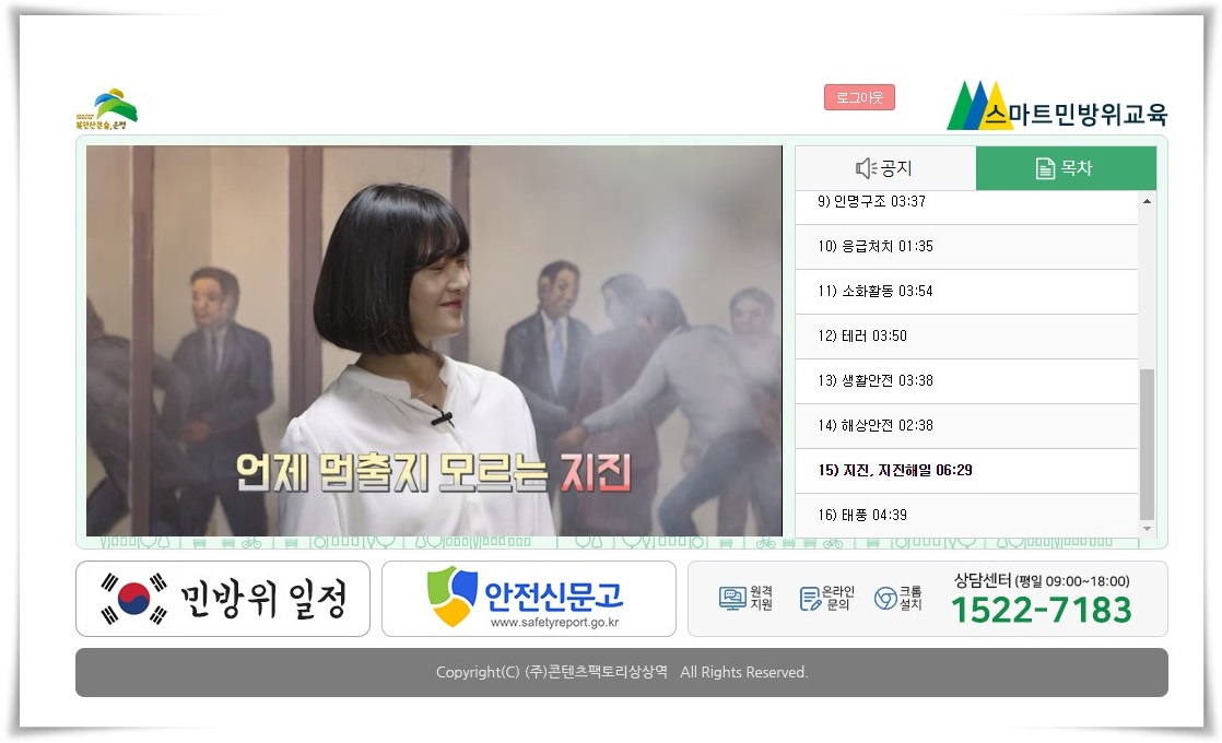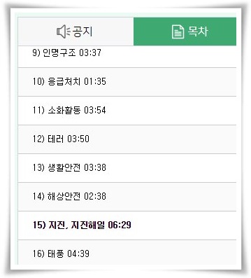 민방위 사이버교육 홈페이지에 접속 자신의 개인정보를 입력하고 나면 총 16개의 목차가 나오는 것을 확인할 수 있습니다. 총 1시간 정도의 분량으로 해당 동영상을 다 들어야지 다음 단계로 넘어갈 수가 있습니다.