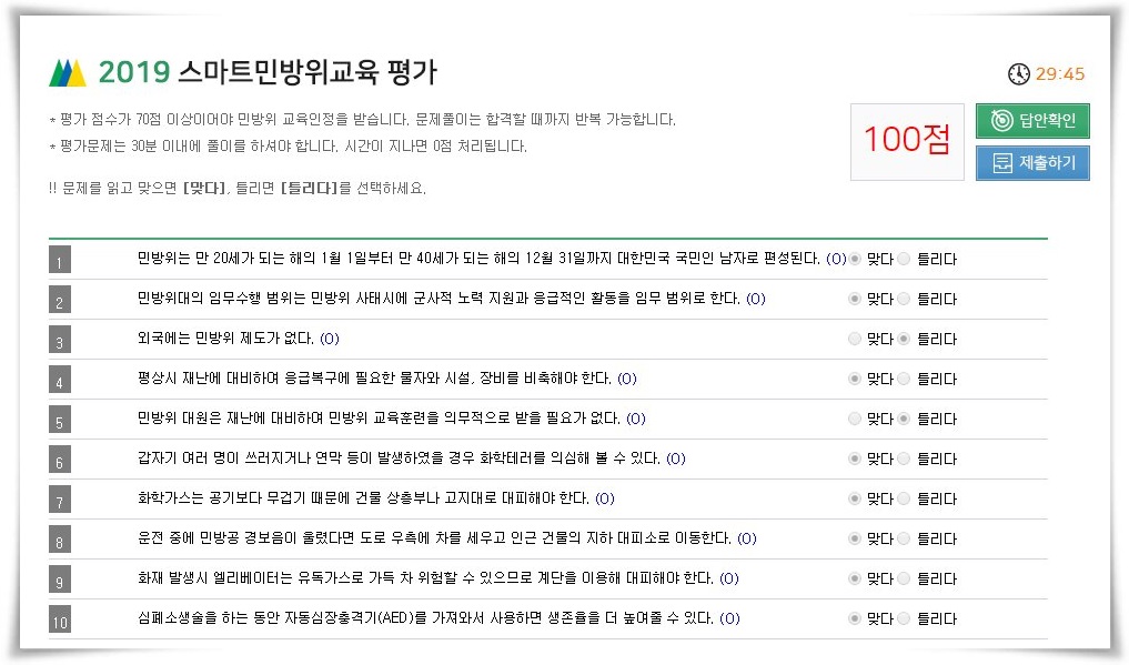 스마트 민방위 교육 평가시험은 30분인데 10분도 안돼서 다 푼 것 같습니다. 문제를 다 풀고 난 후 제출하기를 하면 끝인데요.