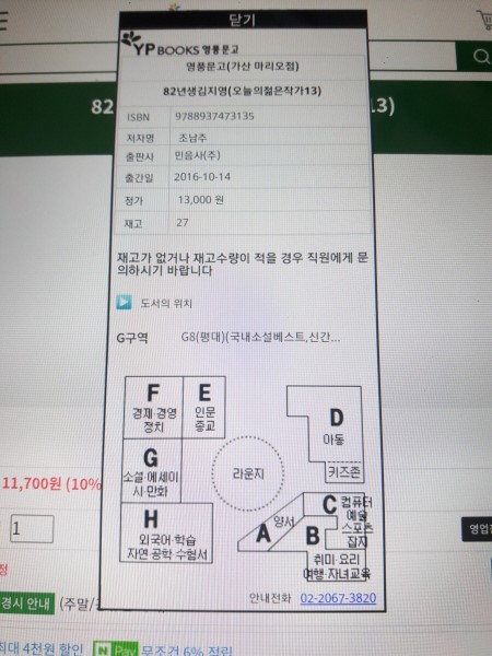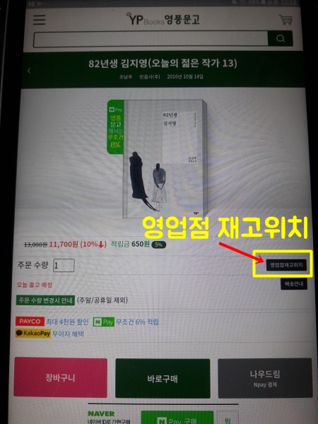 원작 소설을 선택 후 상세 페이지로 들어가니 가격정보와 함께 우측 하단에 영업점 재고 위치라는 버튼이 있는 것을 확인할 수 있다.