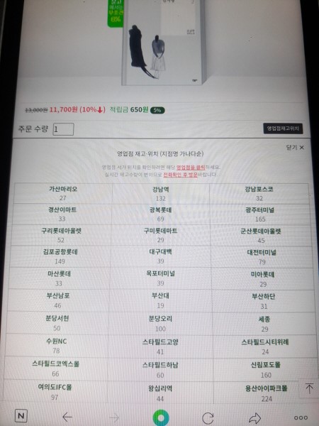해당 버튼을 누르게 되면 전국의 영풍문고 지점별 현재 재고량을 한눈에 확인할 수가 있다.