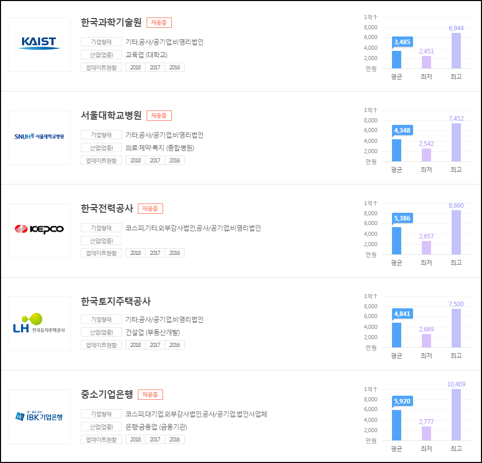 이밖에도 6위부터 10위까지 공기업 연봉을 살펴보면 한국 과학기술원, 서울대학교 병원, 한국전력공사, 한국 토지주택공사, 중소기업은행 등 평소 우리가 자주 듣던 기업들이 많은 것으로 조사가 되었습니다.