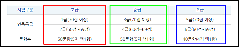 시험 문제는 고급, 중급 모두 5지 선답으로 총 50문항이 출제되면서 고급시험의 경우 70점 이상 1급, 60점~69점 2급, 중급 시험의 경우 70점 이상 3급, 60점~69점 4급의 자격을 인증받을 수 있습니다.