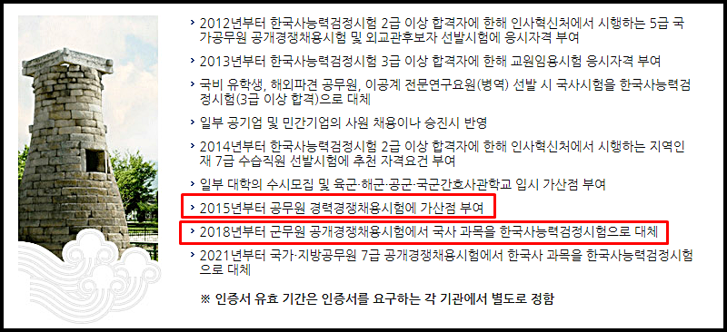 최근 한국사 시험의 중요성이 나날이 대두되면서 이미 많은 기업과, 국가시험에서 한국사 과목을 필수로 포함되는 경우가 많습니다.