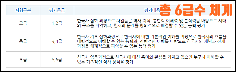 이와 같은 한국사 시험은 총 6계의 급수로 나뉘어 져 있다.