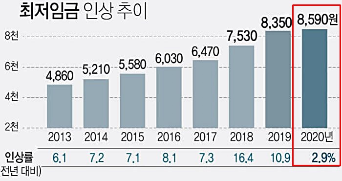 2018년 16.4% 2019년 10.9% 씩 오르며 가파르게 상승한 최저시급이 2020년 들어서 다소 주춤한 것이죠.