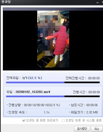 조금씩 인코딩이 되면서 동영상이 회전되는 것을 알수 있습니다. 미리 보기 화면에서는 자신이 회전하고자 하는 방향대로 미리보기를 보여주기 때문에 혹시라도 잘못되었다면 회전 방향 선택을 다시 한번 살펴보시기 바랍니다.