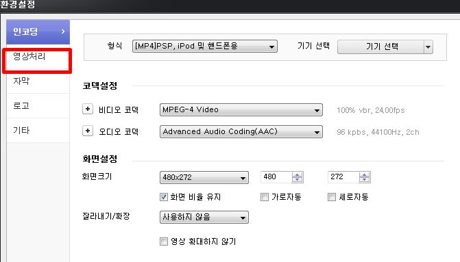 환경설정에는 인코딩, 영상처리, 자막, 로고등 다양한 편집을 할 수 있는 기능들이 있습니다.