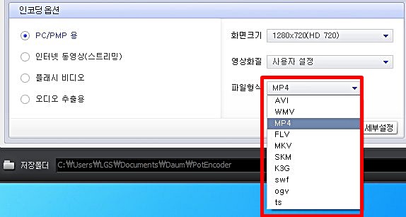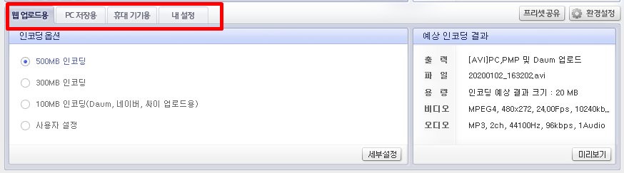 웹 업로드용, pc 저장용, 휴대기기용 등 다양하게 있는데 pc 저장용으로 설정하는 것이 가장 무난하다고 볼 수 있습니다.