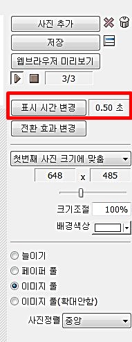 사진을 첨부한 후 다음 사진으로 변동되기 까지의 시간을 변경할수가 있는데. 이시간을 어떻게 선택하는냐에 따라서 움직임이 빨라지고 느려질수가 있다.