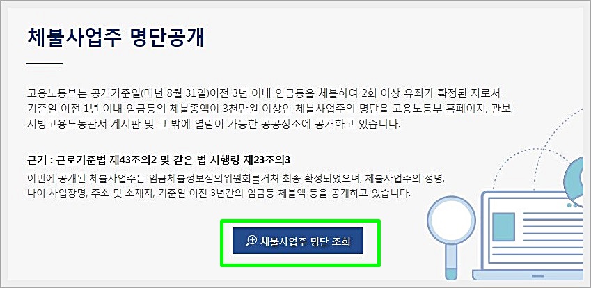 이러한 상황이 자주 발생하다 보니 고용노동부에서는 임금체불 사업주로부터 피해를 받지 않도록 그 명단을 공개하고 있습니다.