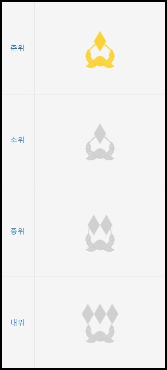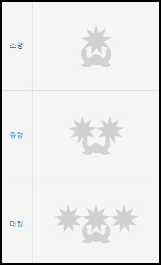 장교의 겨우 소위-중위-대위로 계급이 나누어져 있다.