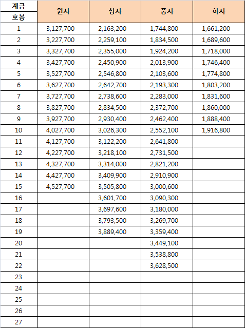 공무원은 여러 직종으로 구분이 된다. 그중에서 군인의 경우 일반 공무원과는 달리 군인 봉급표에 따라서 급여가 책정되어있다.