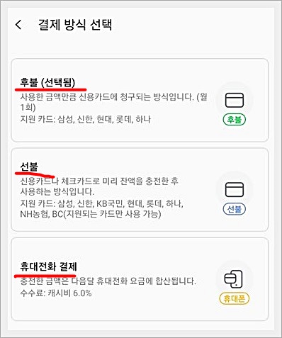 결제방식은 총 3가지로 나누어 있는데 후불, 선불, 휴대전화 결제 등 자신이 원하는 방법을 선택하면 됩니다.