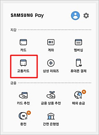 그중 교통카드 버튼이 있는 게 보이시나요? 해당 버튼을 클릭하고 들어가시면 됩니다.