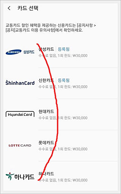 삼성페이 교통카드는 현재 총 5개의 카드사와 제휴가 되어있어 해당 카드로만 등록이 가능합니다. 삼성카드, 신한카드, 현대카드, 롯데카드, 하나카드입니다.