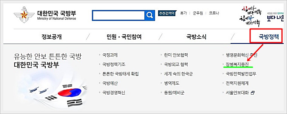 국방부 홈페이지에 들어가면 국방정책 게시판에 장병복지증진에 대한 안내가 나와있습니다.