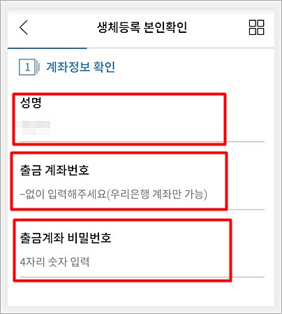 처음 지문등록을 하는 경우 개인정보 확인부터 필요하다. 이름, 주민번호, 연락처 인증을 통하여 확인이 되면 다음 과정인 계좌정보 확인으로 넘어간다.