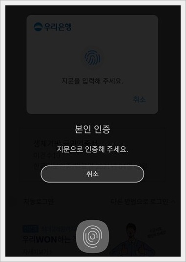 핀번호를 적 고난 후 생체 인증서가 발급되었다고 안내가 나오면 은행 앱을 다시 접속해 보도록 하자. 그럼 위와 같이 지문으로 인증하라는 안내가 나오는 것을 볼 수 있다.