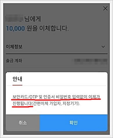 이제 이체를 해보기로 했다. 이체방법은 원래 하던 것과 동일한 방식으로 받는 사람 정보와 금액을 적었다. 마지막 단계에서 OTP 번호 혹은 보안카드 번호를 적으라는 안내 대신 위와 같이 이체가 진행될 거라는 안내가 나왔다.