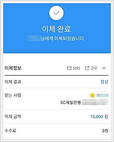 확인 버튼을 누르니 정말 보안카드 입력 없이 바로 이체가 되는 것을 알 수 있었다.
