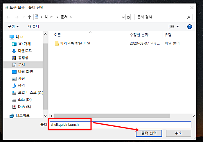 위와 같이 새도 구 모음을 선택하게 되면 새로운 창이 열리게 되는 것을 확인할 수 있는데요. 여기서 빨간색 박스로 칠한 부분에 다음과 같이 shell:quick launch를 적어 넣고 폴더 선택을 눌러주시면 됩니다.