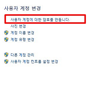 사용자 계정에 들어가 보면 암호 만들기, 계정 이름 변경, 사진 변경, 다른 계정관리 등의 카테고리가 있습니다. 그중 사용자 계정에 대한 암호를 만듭니다를 선택하시면 됩니다.