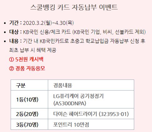 4월 30일까지 국민카드로 스쿨뱅킹 등록 시 5천 원의 캐시백과 함께 자동으로 경품에 응모가 되는데요 총 100명에게 추첨을 통해서 공기청정기, 다이슨 헤어드라이기, 포인트리 등을 제공한다고 합니다.