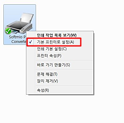그다음 설치되어 있는 소프트미오 프로그램을 선택 기본 프린터로 지정을 해주는것이다. 가상 프린터 개념이다 보니 인쇄버튼을 누르면 pdf 파일로 변환이 되는 방식이다.