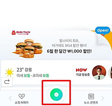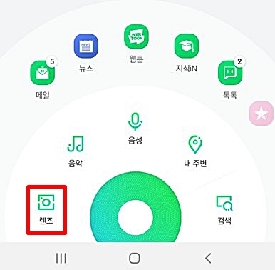 네이버 앱 실행후 하단에 있는 녹색 모양의 동그란 원형 버튼을 눌러보자. 그럼 다음과 같은 화면을 볼 수 있다. 여기서 빨간색 네모 박스로 표시된 렌즈 버튼을 누르면 QR코드 스캔 페이지로 넘어가게 된다.