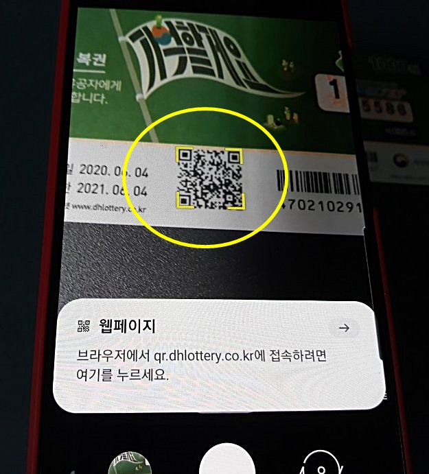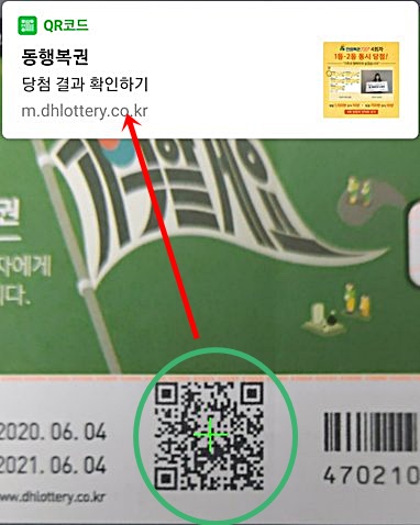 연금복권에 있는 코드에 핸드폰을 가져다대면 자동적으로 코드를 인식하면서 코드에 담긴 내용과 정보가 안내가 된다.