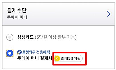 로켓 와우를 이용하게 되면 장점 중 하나가 바로 쿠페 이머니를 통한 결제 시 포인트를 적립해주는 제도라 할 수 있습니다. 최대 물건 구매금액의 5%를 적립해주는데 나중에 쇼핑할 때도 사용이 가능하기 때문에 할인을 받는 거라 할 수 있습니다.