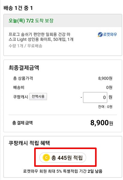 때마침 마스크가 필요했던 찰나 아침에 일어나서 주문을 했는데 오늘 저녁에 배송이 된다고 합니다. 물론 쿠페이머니를 통해서 결제를 진행했기 때문에 445원이라는 적립도 받을 수가 있었습니다.