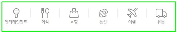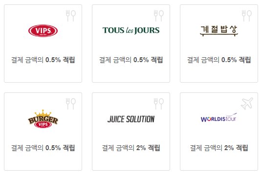한눈에 모든 카테고리를 확인하기가 어려운 경우 각 카테고리별로 보는것이 좋습니다. 외식, 쇼핑, 여행, 통신 등으로 구분되어 있기 때문이죠.
