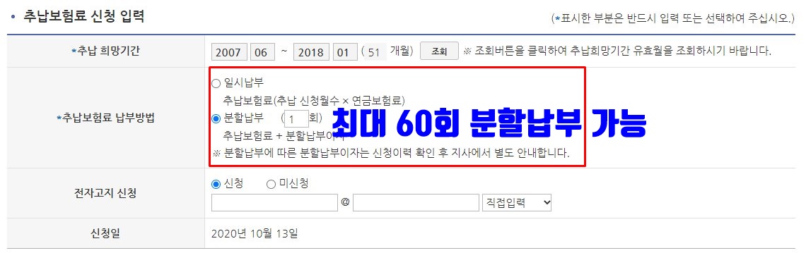 추후납부 시 금액이 부담되는 사람들을 위해서 분할납부까지도 가능하게 하고 있다. 분할납부는 총 60회에 걸쳐서 납부할 수 있지만 분할이자인 1.1%가 발생한다는 점을 참고하자.